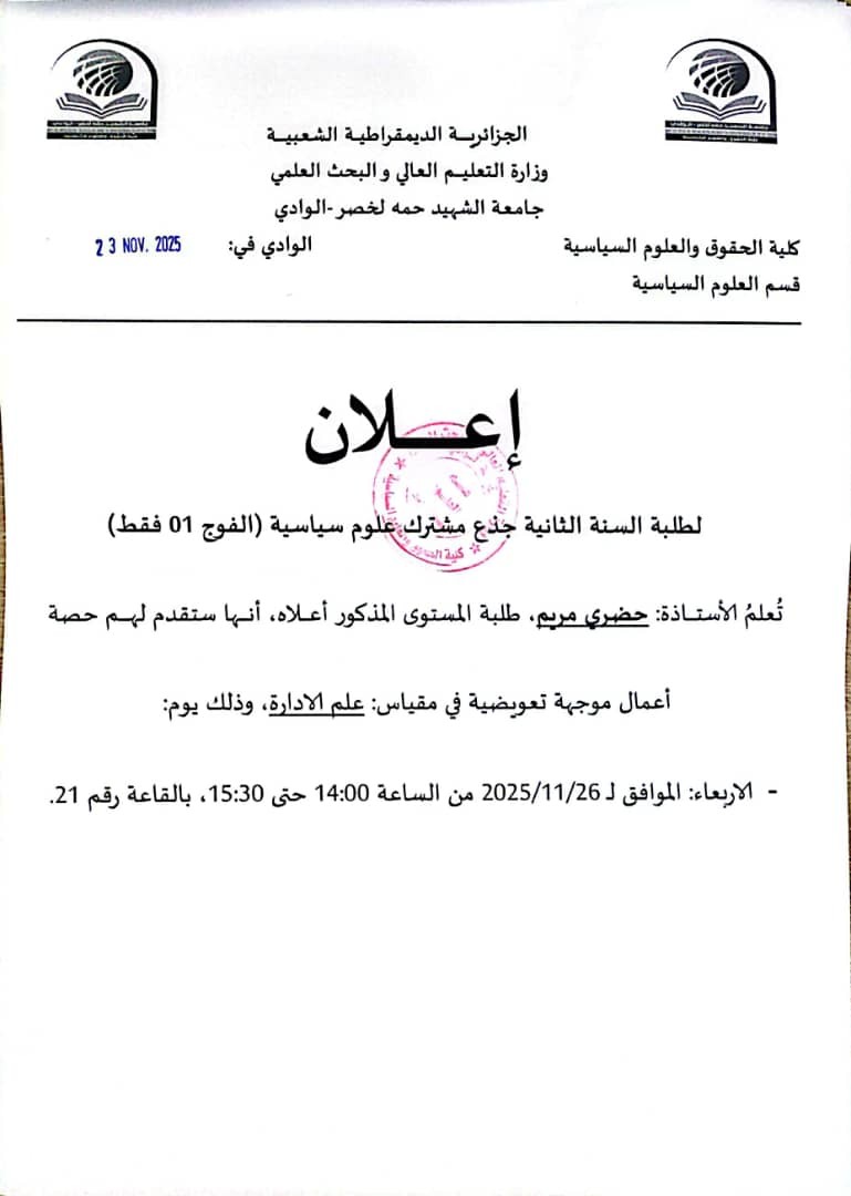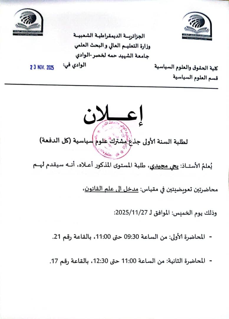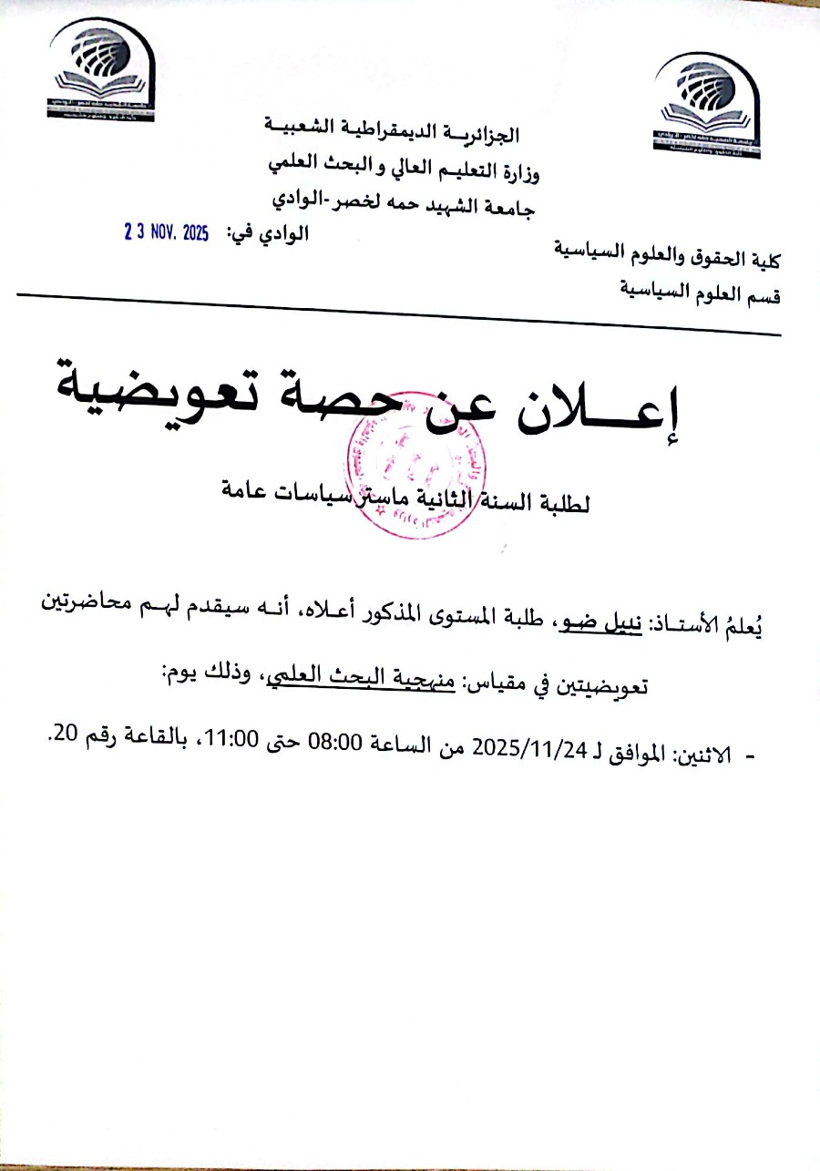 ب/خ: حصص تعويضية على مستوى قسم العلوم السياسية
