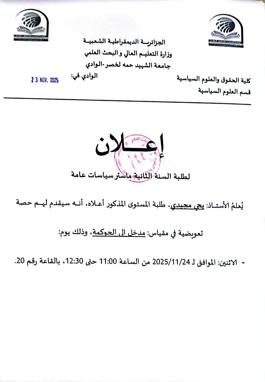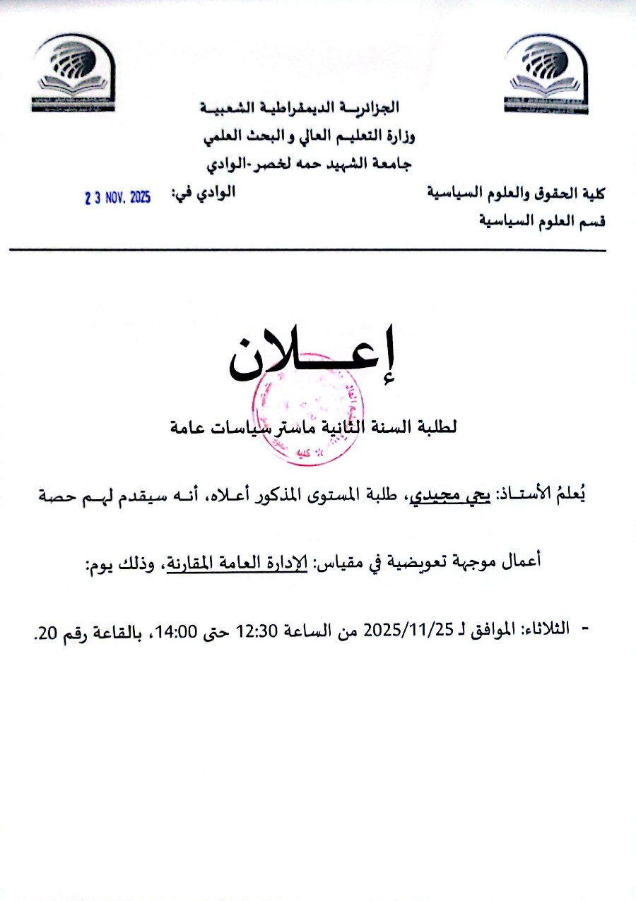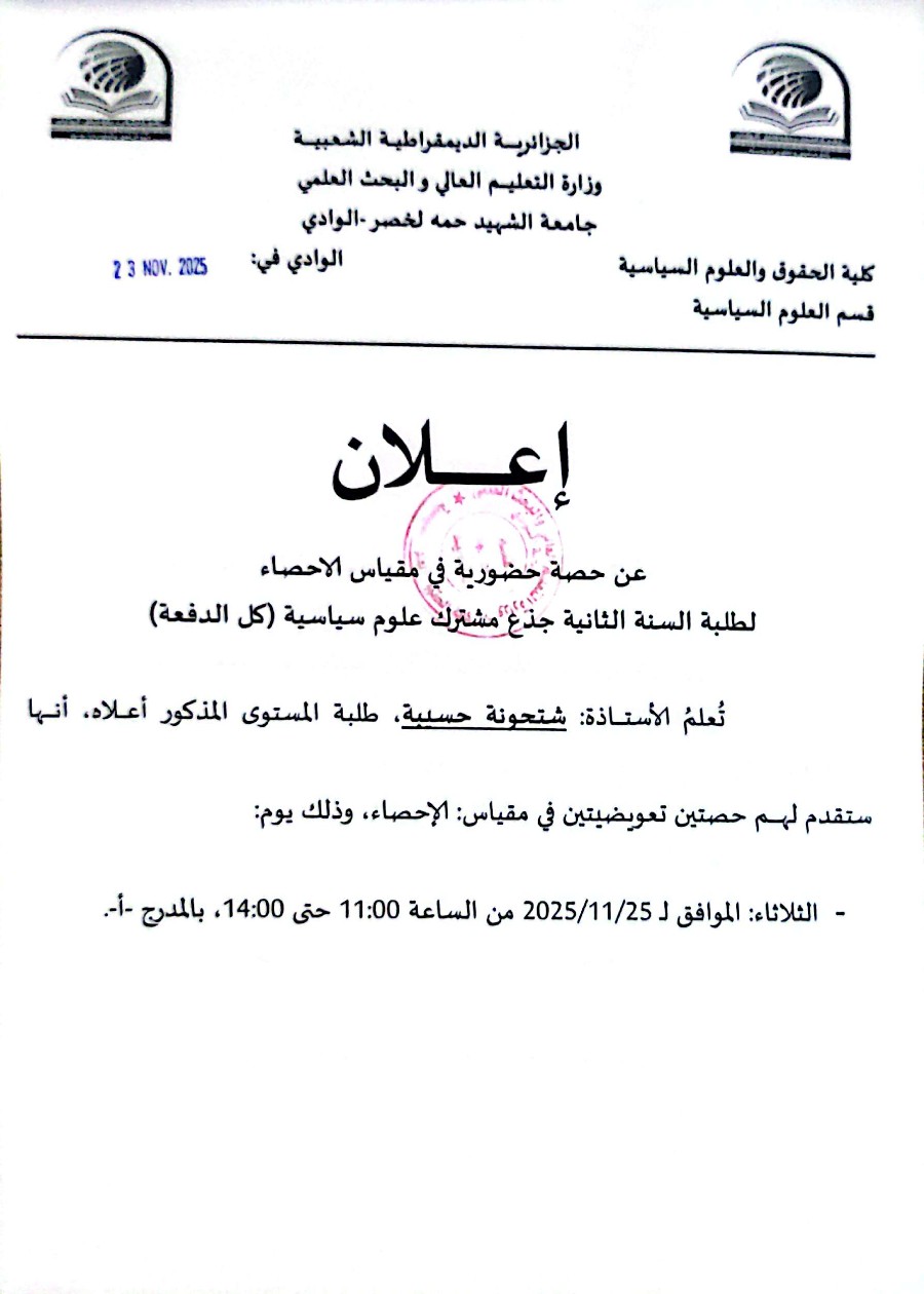 ب/خ: حصص تعويضية على مستوى قسم العلوم السياسية