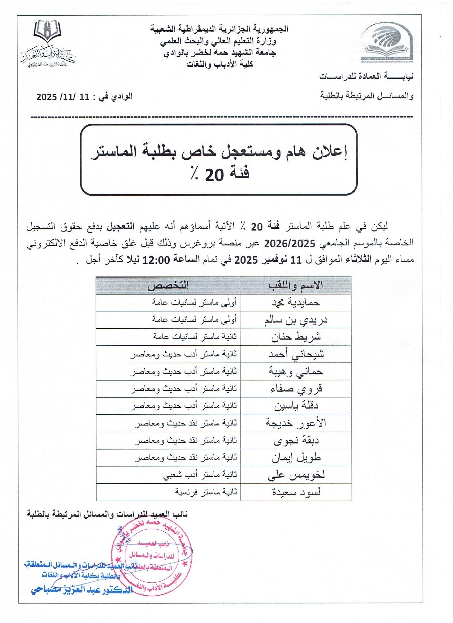 إعـلان هـام ومستعجل جداخاص بطلبة الماستر فئة 20 بالمئة