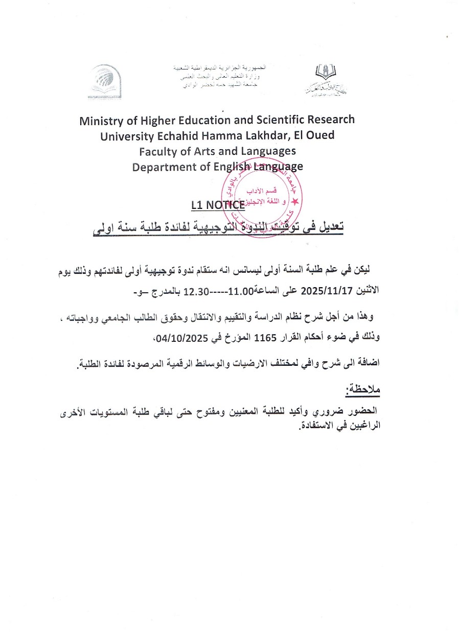 تعديل في توقيت الندوة التوجيهية لفائدة طلبة سنة أولى ليسانس