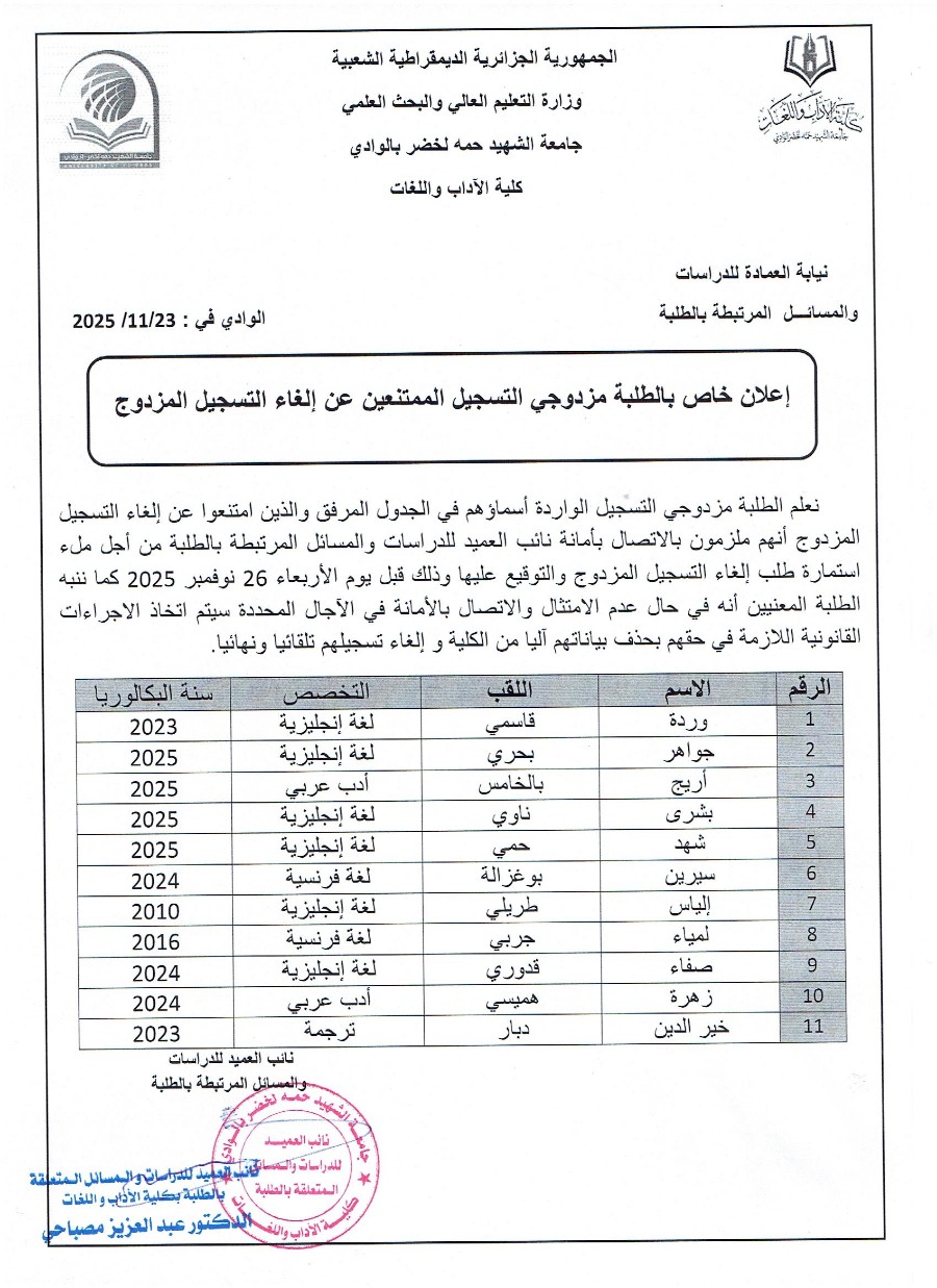 إعـلان خـاص بالطلبة مزدوجي التسجيل الممتنعين عن إلغاء التسجيل المزدوج