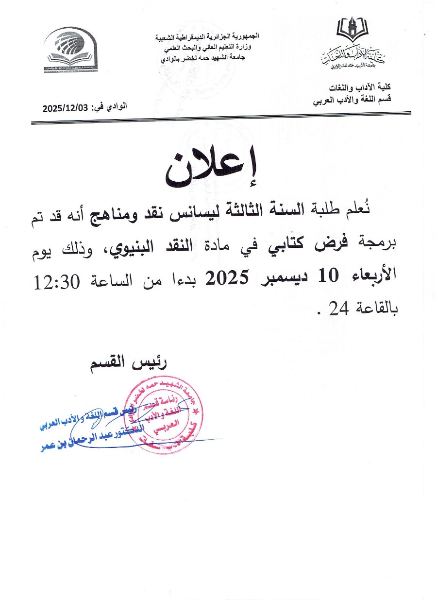إعلان لطلبة السنة الثالثة ليسانس نقد ومناهج