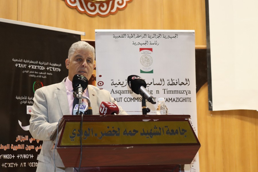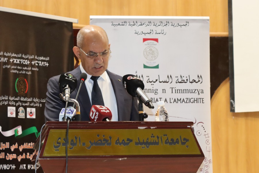 نظّمت كلية الآداب واللغات بجامعة الشهيد حمه لخضر بالوادي ملتقى وطنيا هاما تحت عنوان:"الأمن الثقافي في الجزائر ودور اللغة الأمازيغية في صون الهوية الوطنية"، في خطوة تعكس حرص المؤسسة الجامعية على فتح فضاءات علمية جادة تعالج قضايا الهوية والانتماء، والتحصين الثقافي في السياق الوطني الجزائري.وشهد الملتقى حضورا رسميا رفيع المستوى، حيث أشرف على افتتاحه والي ولاية الوادي السيد العربي بهلول، الذي أكّد في كلمته على أهمية الأمن الثقافي كجزء لا ينفصل عن الأمن القومي، مشددا على الدور الحيوي للغة بمختلف روافدها الوطنية في تعزيز الوحدة وصون الشخصية الجزائرية من أي اختراقات فكرية أو ثقافية تهدد استقرار المجتمع كما سبقت كلمة السيد الوالى كلمة لكل من السيد مدير الجامعة البروفيسور عمر فرحاتي والسيدة عميد كلية الآداب واللغات ومديرة الملتقى البروفيسورة دلال وشــن..كما حضر اللقاء الأمين العام للمحافظة السامية للأمازيغية، السيد عصاد سي الهاشمي، إلى جانب ممثلين عن السلطات الأمنية والعسكرية، إضافة إلى رئيس المجلس الشعبي الولائي والأمين العام للمنظمة الوطنية للمجاهدين - الوادي، إلى جانب عدد معتبر من إطارات الجامعة وممثلي الخدمات الجامعية، مما يؤكد البعد الاستراتيجي الذي حظي به الملتقى وأهميته الوطنية.