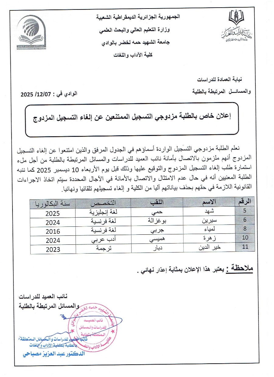 إعلان هـام خاص بالطلبة مزدوجي التسجيل الممتنعين عن إلغاء التسجيل المزدوج