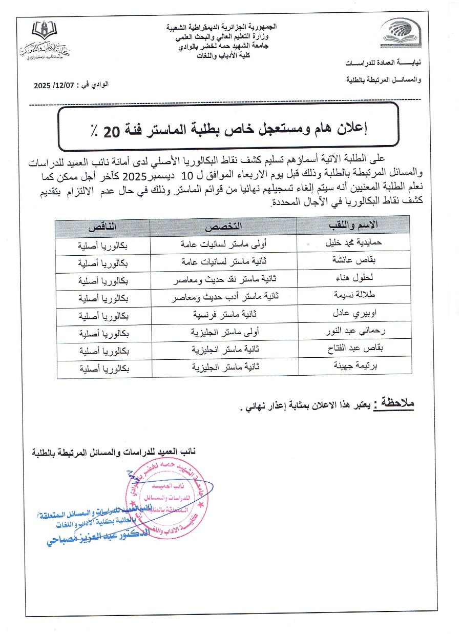 إعلان هـام خاص بطلبة الماستر فئة 20%