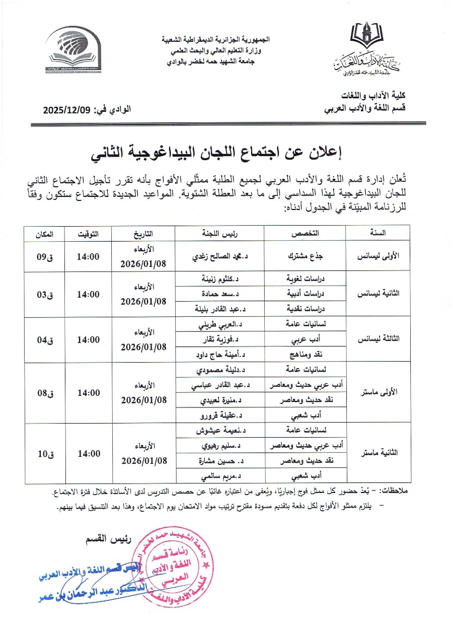 إعــلان عن اجتماع اللجان البيداغوجية الثانيقسم اللغة والأدب العربي