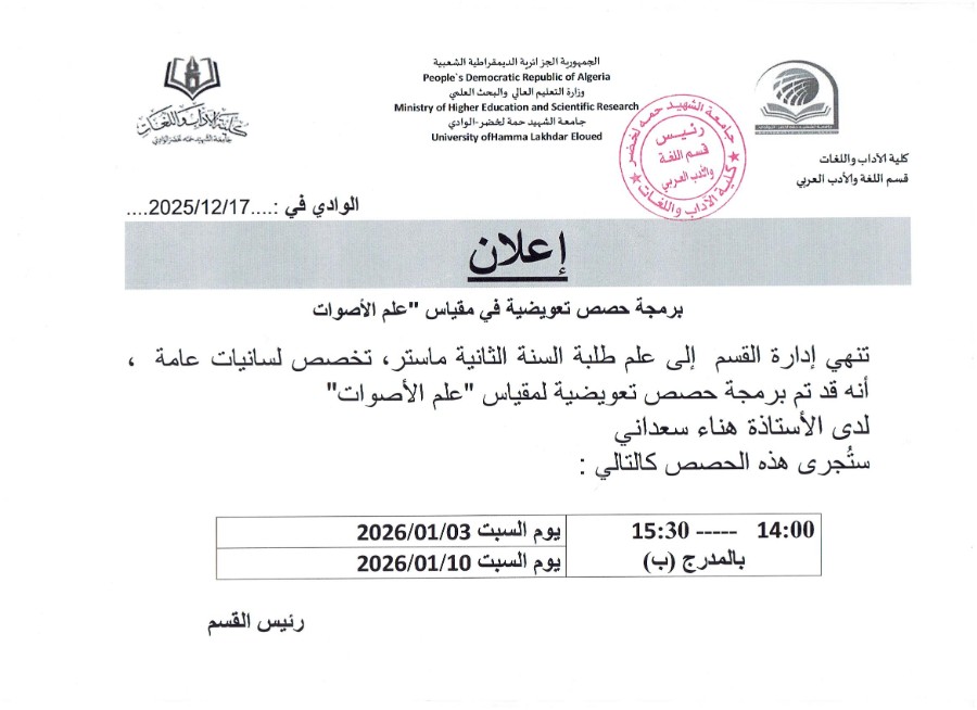 إعلان هـام لطلبة سنة ثانية ماستر لسانيات عامة