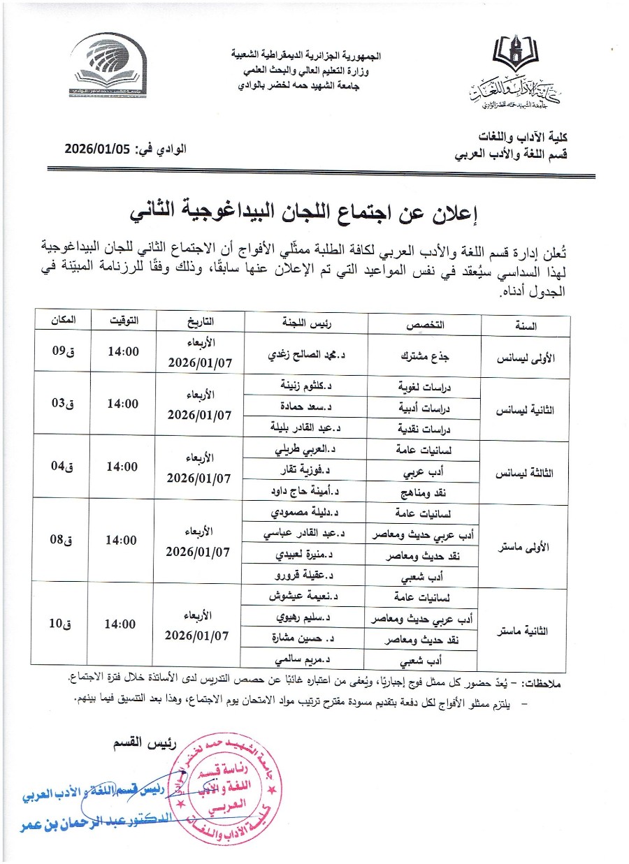 إعــلان عن اجتماع اللجان البيداغوجية الثاني