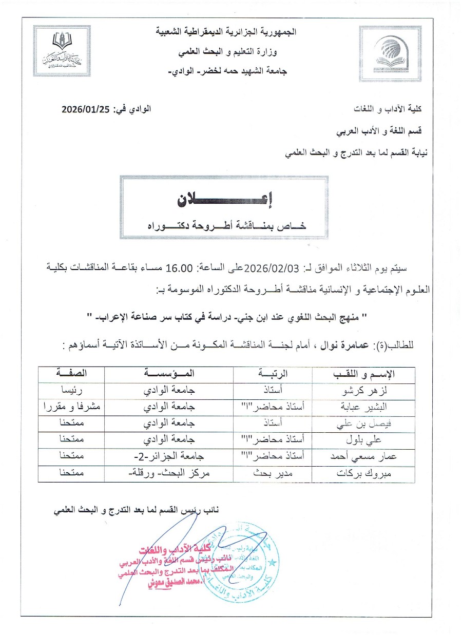 إعـلان خـاص بمناقشة أطروحة دكتوراه