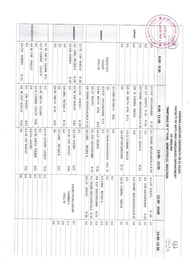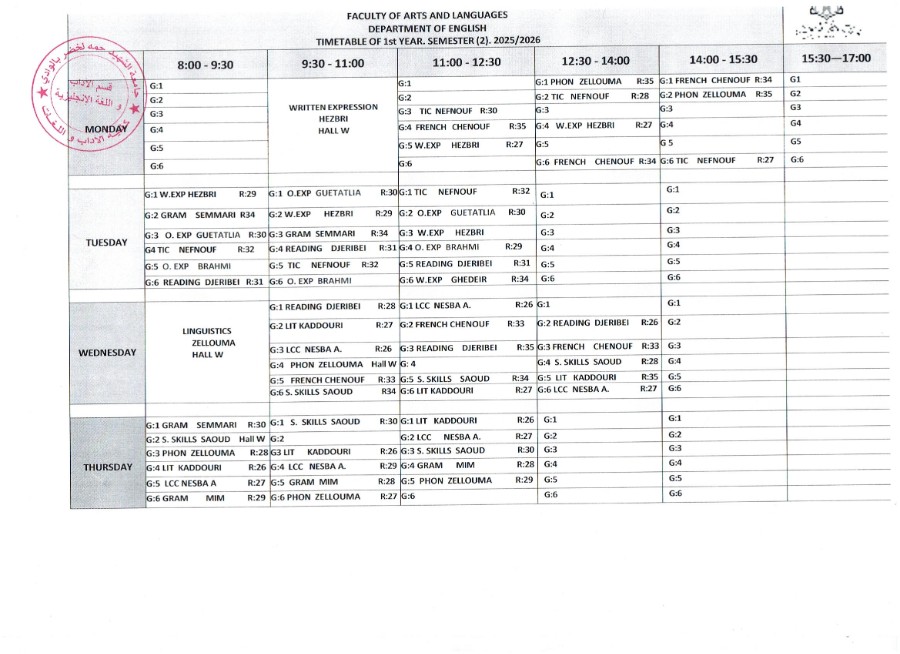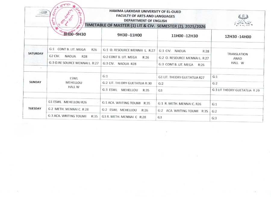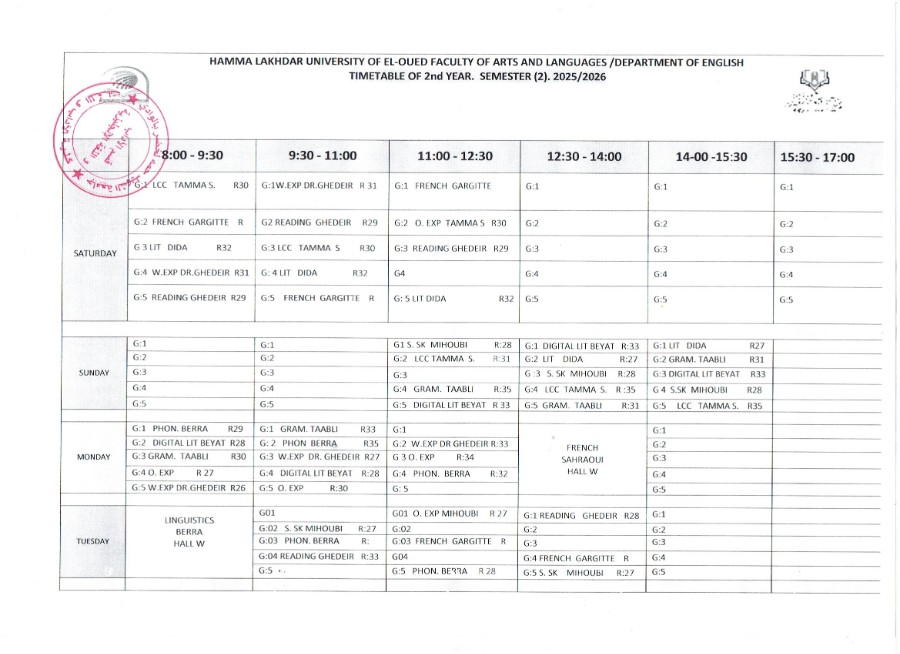 الجداول الزمنية للفصل الثاني
