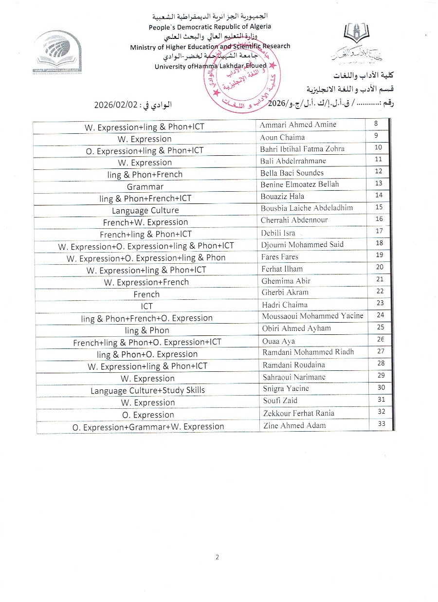 جداول التوزيع الزمني النهائية لكل المستويات للفصل الثاني 2026
