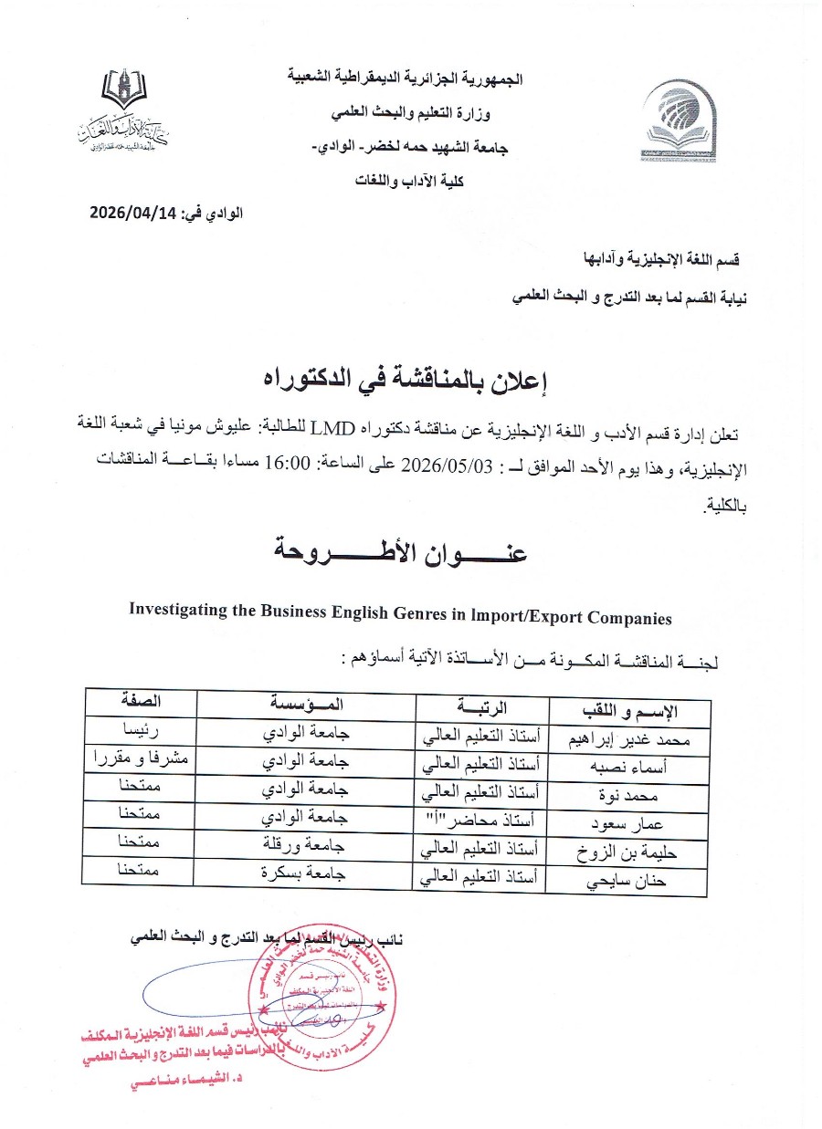 إعلان خاص بمناقشة أطروحة دكتوراه