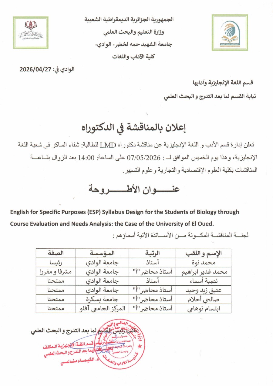 إعلان عن منـاقشـة أطروحة دكتوراه
