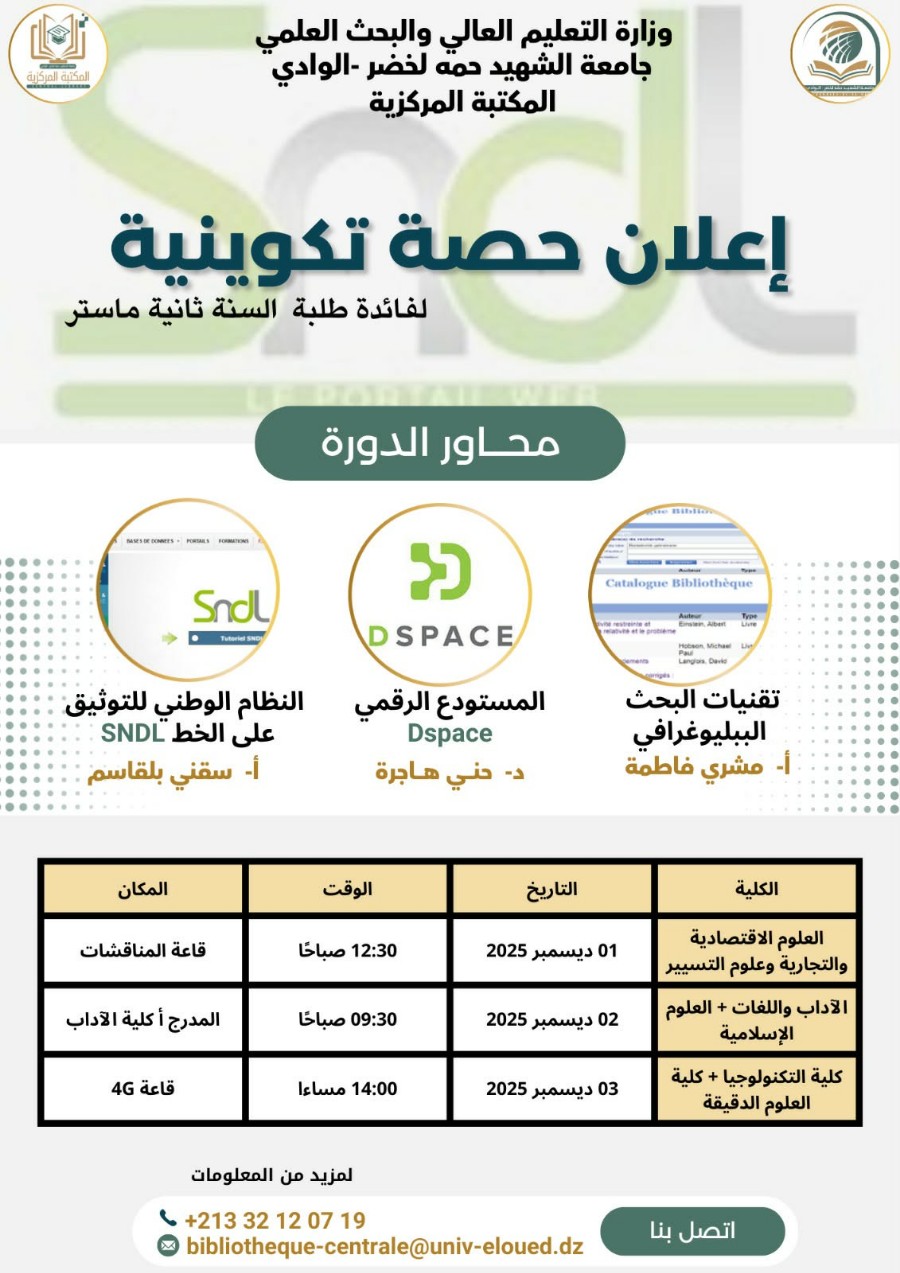 إعلان عن حصة تكوينية لفائدة طلبة ثانية ماستر لجميع الأقسام