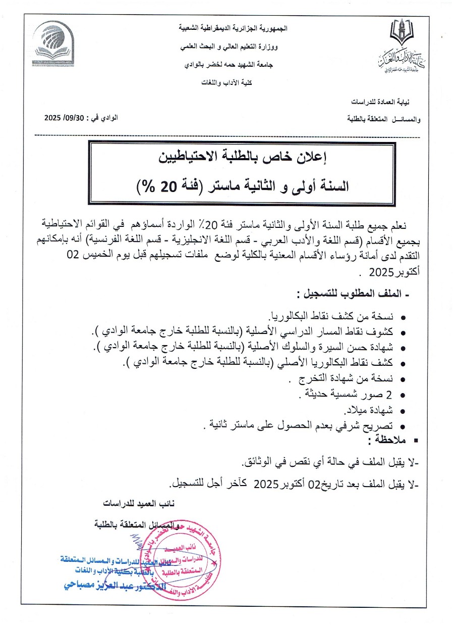 إعـلان خاص بالطلبة الاحتياطيين فة 20 بالمئة