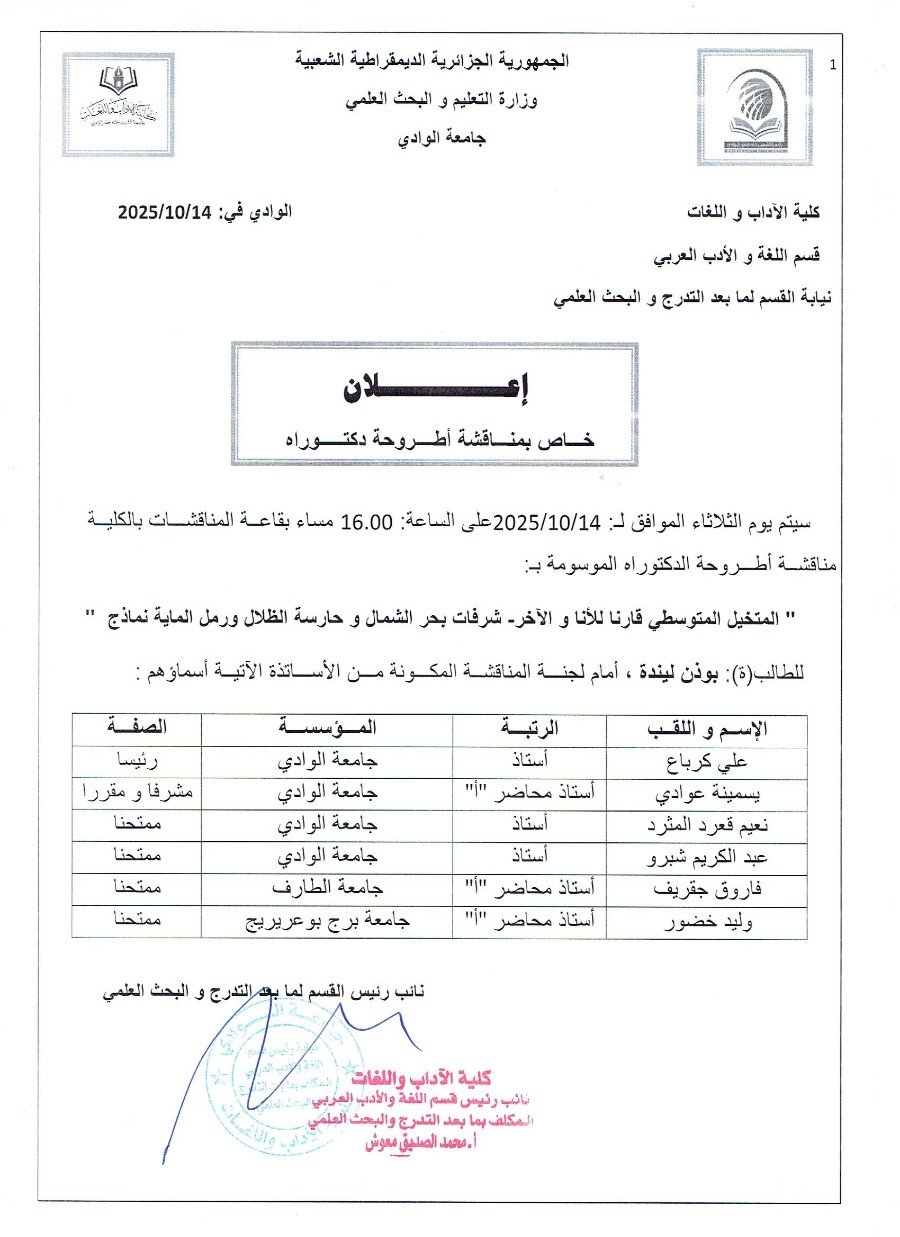 إعـلان خـاص بمناقشة أطـروحـة دكتـوراه