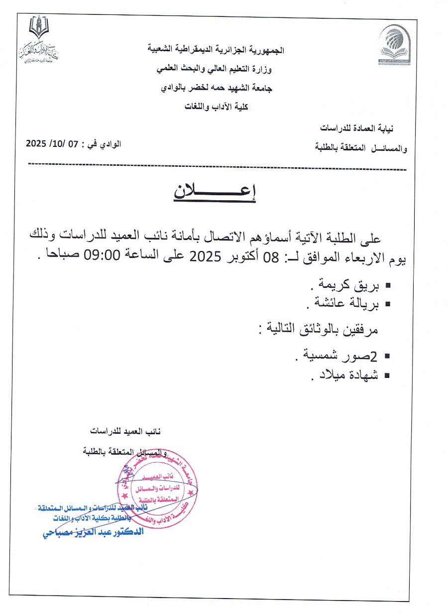 اسدتدعاء للطالبتين بريق كريمة وبريالة عائشة