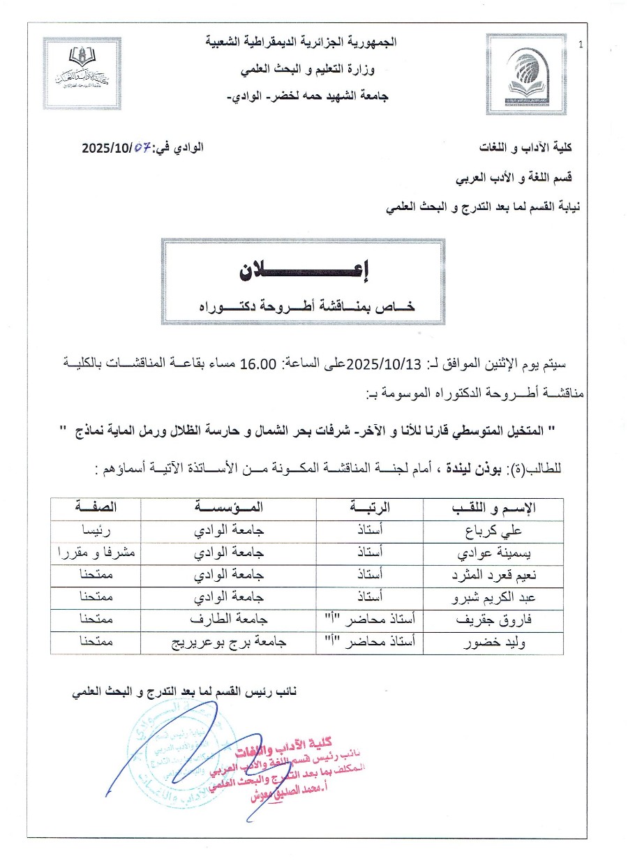 إعـــلان هـام لطلبة قسم اللغة والأدب العربي