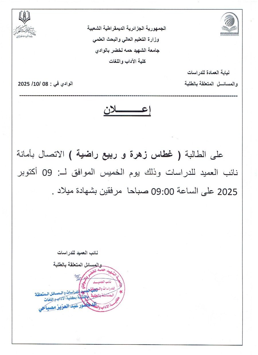 استدعاء للطالبتين غطاس زهرة و ربيــع راضيـة