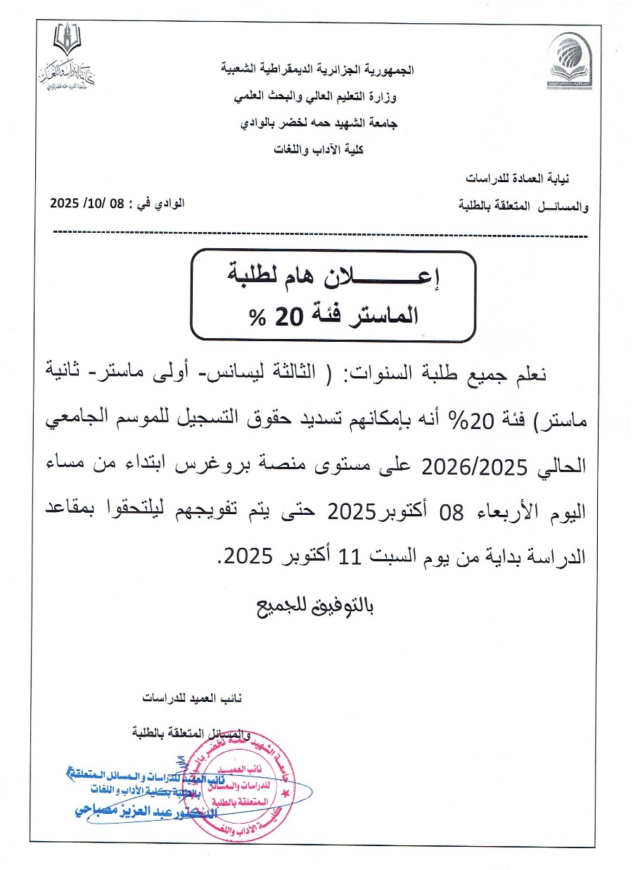اعلان لطلبة ليسانس الماستر فئة 20بالمئة