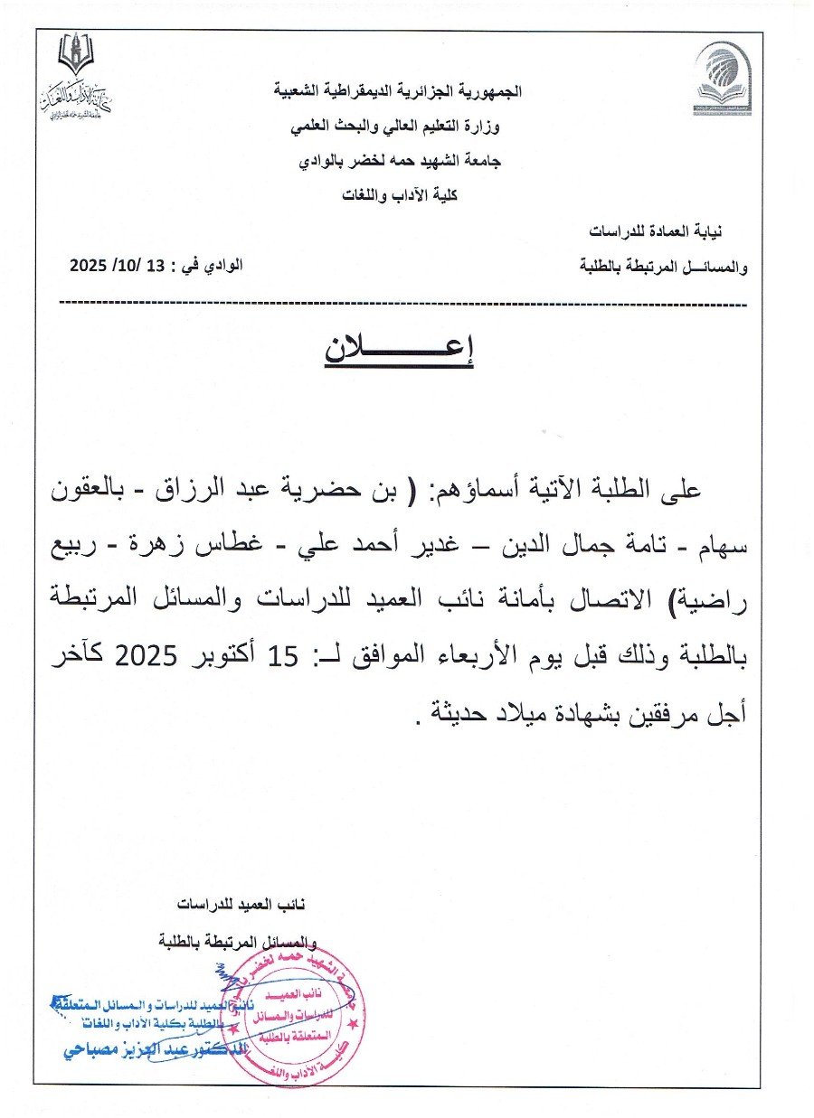 تحيين التوزيع الزمني للدراسة الخاص بالسداسي الأول لقسم الترجمة