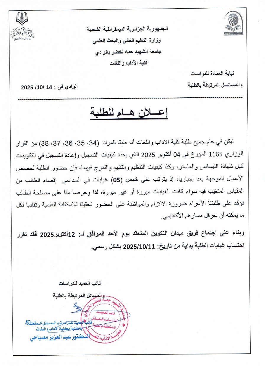 إعـلان هـام للطلبة بخصوص العطلة الأكاديمية