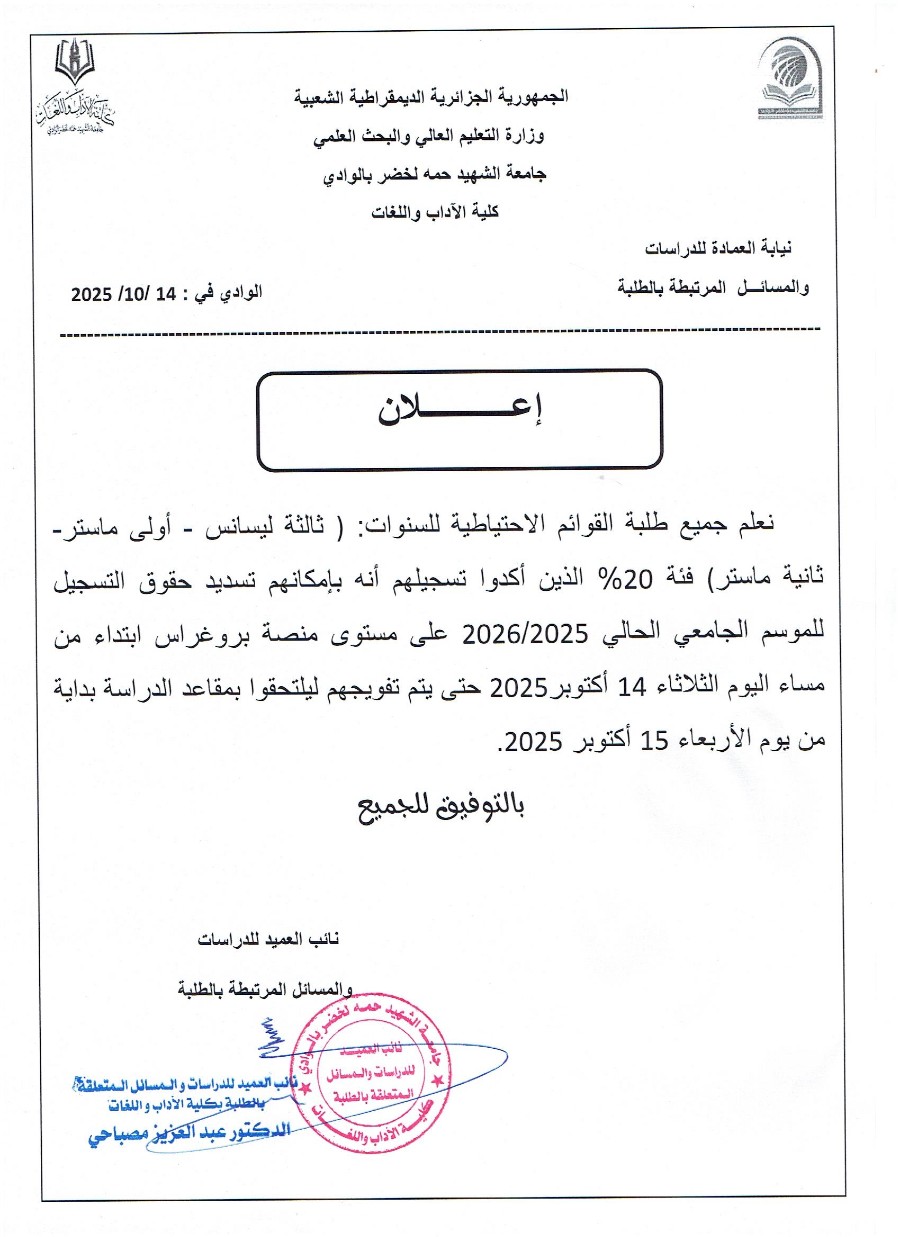 إعلان لطلبة الماستر الاحتياطيين فئة 20 بالمئة