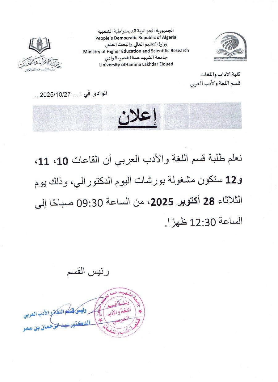 إعـــلان هـام لطلبة قسم اللغة والأدب العربي