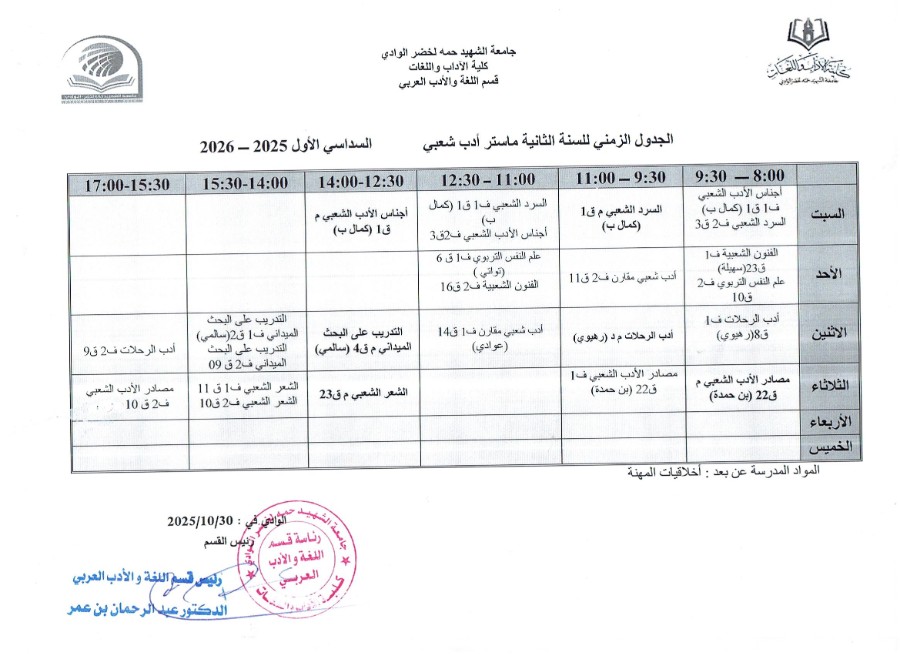 الجـدول الزمني المحين للسنة الثانية ماستر أدب شعبي