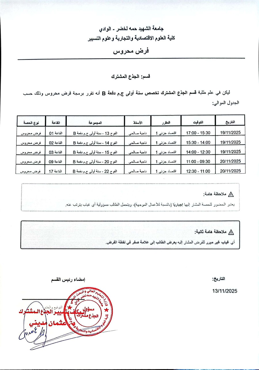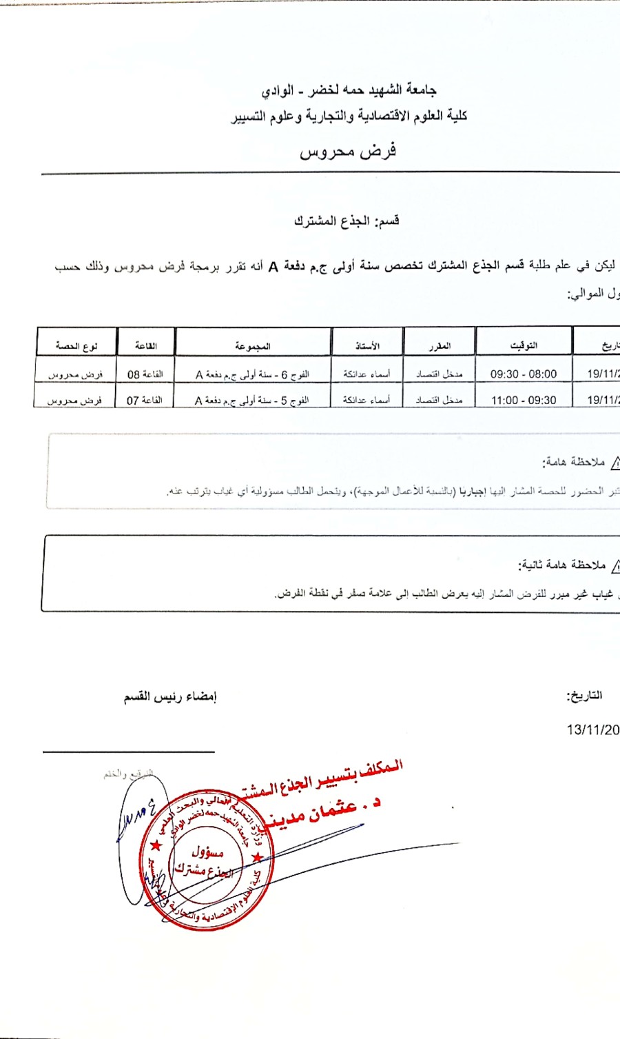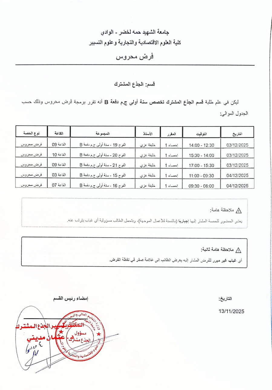 برمجة امتحان اعمال موجهة سنة اولى جذع مشترك احصاء+ مدخل اقتصاد + اقتصاد جزئي كمايلي: