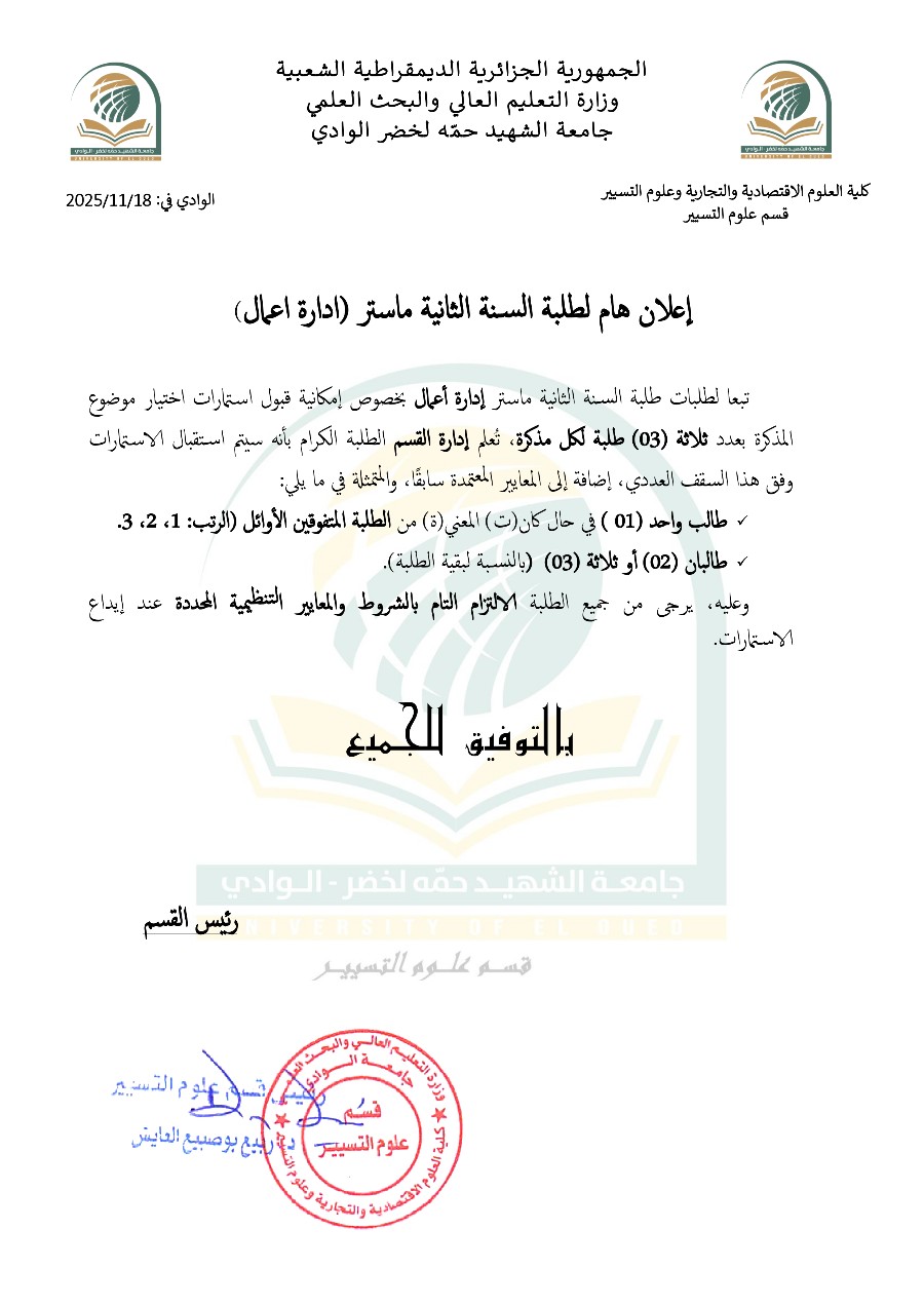 اعلان خاص بطلبة سنة ثانية ماستر إدارة الاعمال