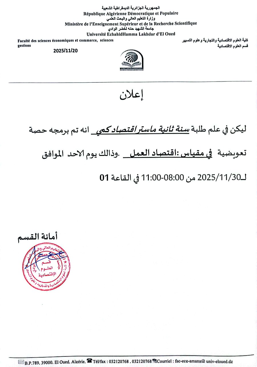 برمجة حصة تعويضية في مقياس اقتصاد العمل لسنة الثانية ماستر اقتصاد كمي