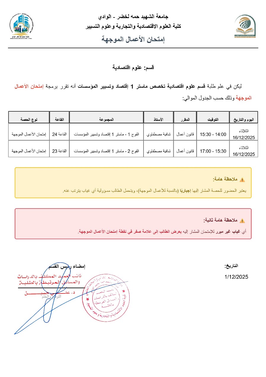 برمجة امتحانات اعمال موجهة لقسم علوم اقتصادية