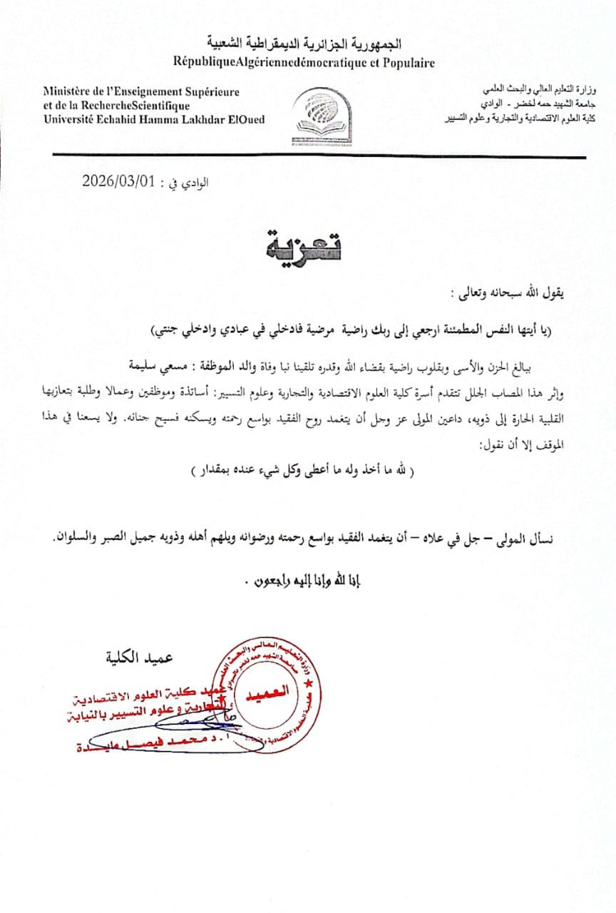 تعزية بوفاة والد موظفة بكلية العلوم الاقتصادية والتجارية وعلوم التسيير: مسعي محمد سليمة