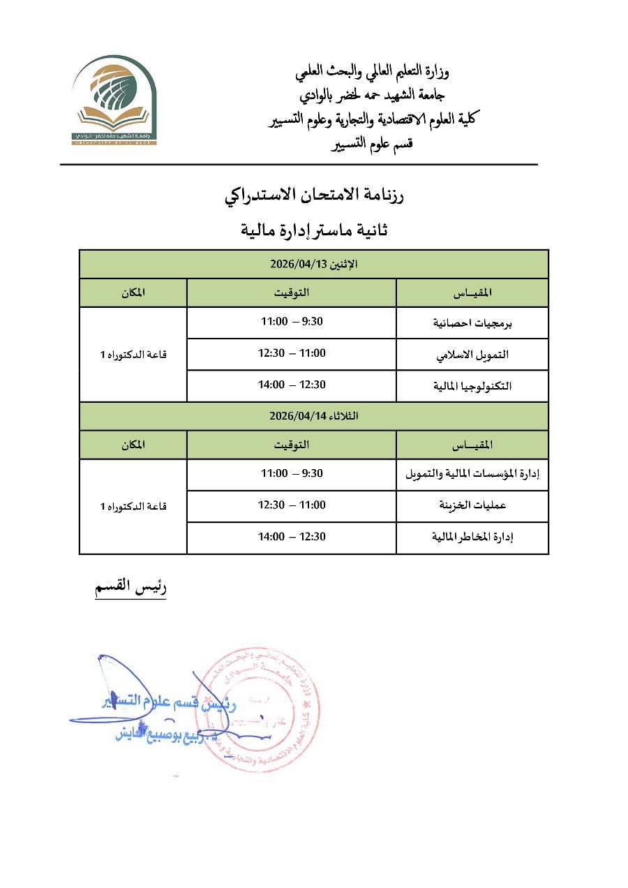 رزنامة الامتحان الاستدراكي لطلبة السنة الثانية ماستر إدارة مالية عن بعد