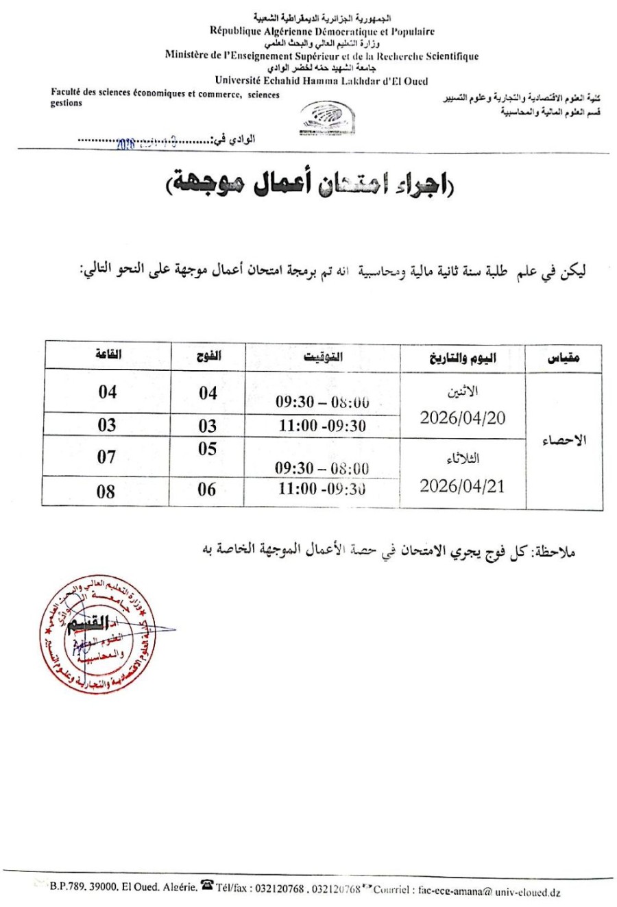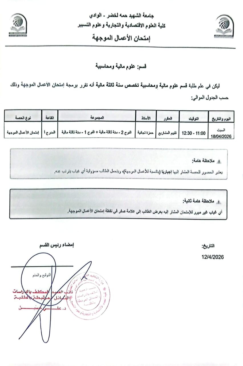 اعلان امتحان اعمال موجهة لقسم علوم تجارية