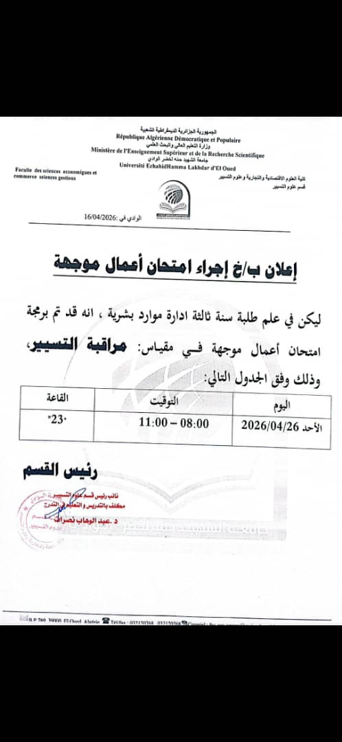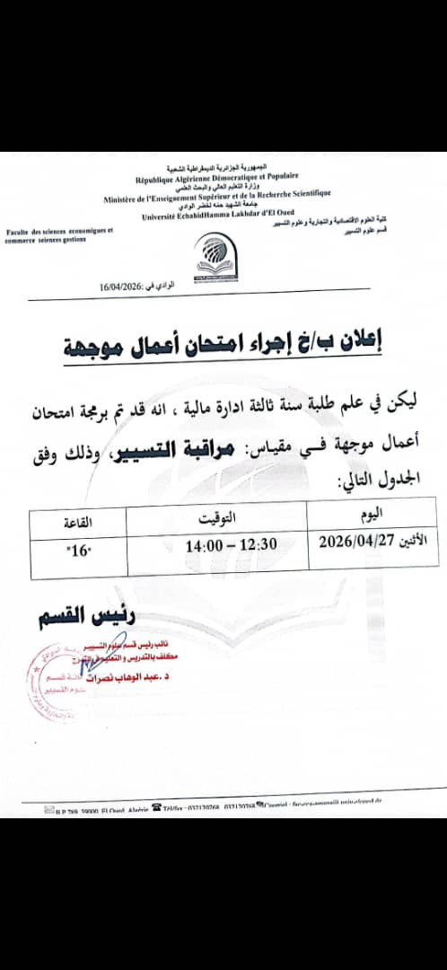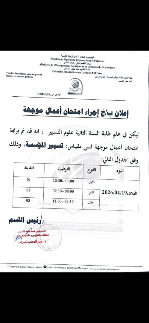 اعلان امتحان اعمال موجهة لقسم علوم التسيير