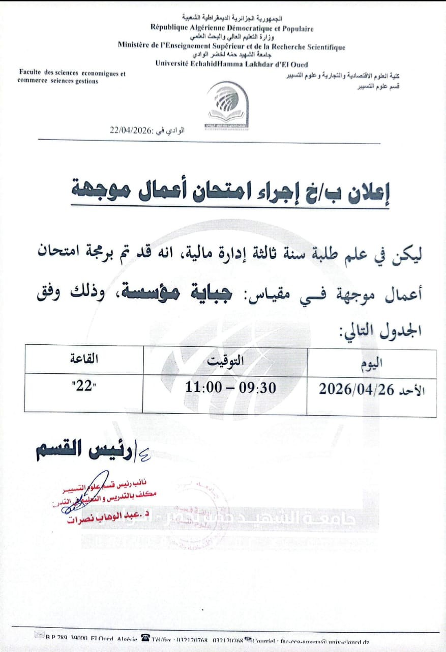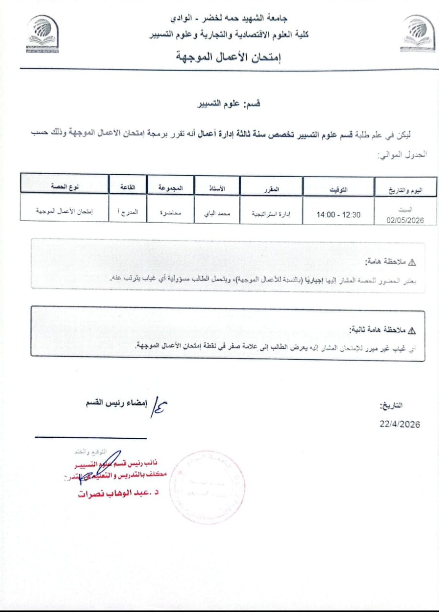 امتحانات اعمال موجهة لقسم علوم تجارية