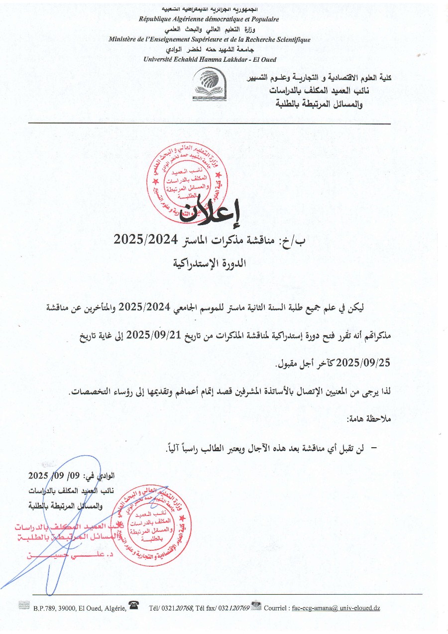 ليكن في علم طلبة السنة الثانية ماستر والمتأخيرن في مناقشة مذكرات تخرجهم أنه قد تقرر فتح دورة استدراكية وذلك وفق الاعلان المرفق ادناه والذي حدد بتاريخ كأخر اجل قبول يوم 2025/09/21 الى غاية 2025/09/25.