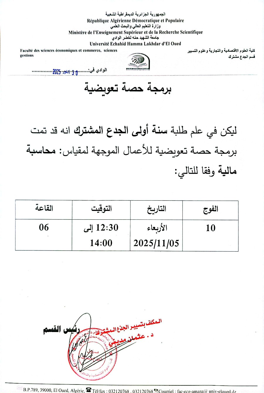 ب/خ برمجة حصة تعويضية لسنة اولى جذع مشترك في مقياس الاعمال الموجهة المحاسبة المالية