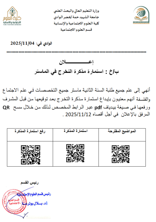 اعلان مذكرات الماستر (قسم العلوم الاجتماعية)