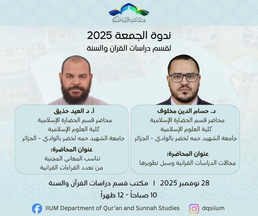 وفد من كليتنا في زيارة علمية إلى الجامعة الإسلامية العالمية بكوالالمبور- ماليزيا، يضم الأساتذة: أد. العيد حذيق، ود. حسام الدين مخلوف من قسم الحضارة؛ ود. محمد العربي ببوش من قسم الشريعة، ود. زكرياء قادي من قسم أصول الدين.