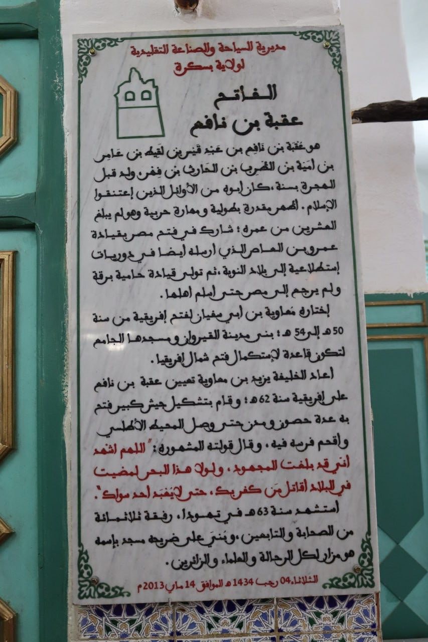 ثم توجه الوفد لزيارة مسجد عقبة بن نافع وفيه تلقى شروحات وافية من طرف المختصين حول أصالة المكان وجذوره، بما يحمله من زخم تاريخي مفعم بالمجد والعز الممتد إلى القرن الثاني للهجرة.وبعد أن عرج الوفد على بعض المواقع الأثرية والمعالم التاريخية البارزة عاد إلى الديار على أمل أن تكون هذه الرحلة دافعا للبحث في تراثنا الثري المتميّز .