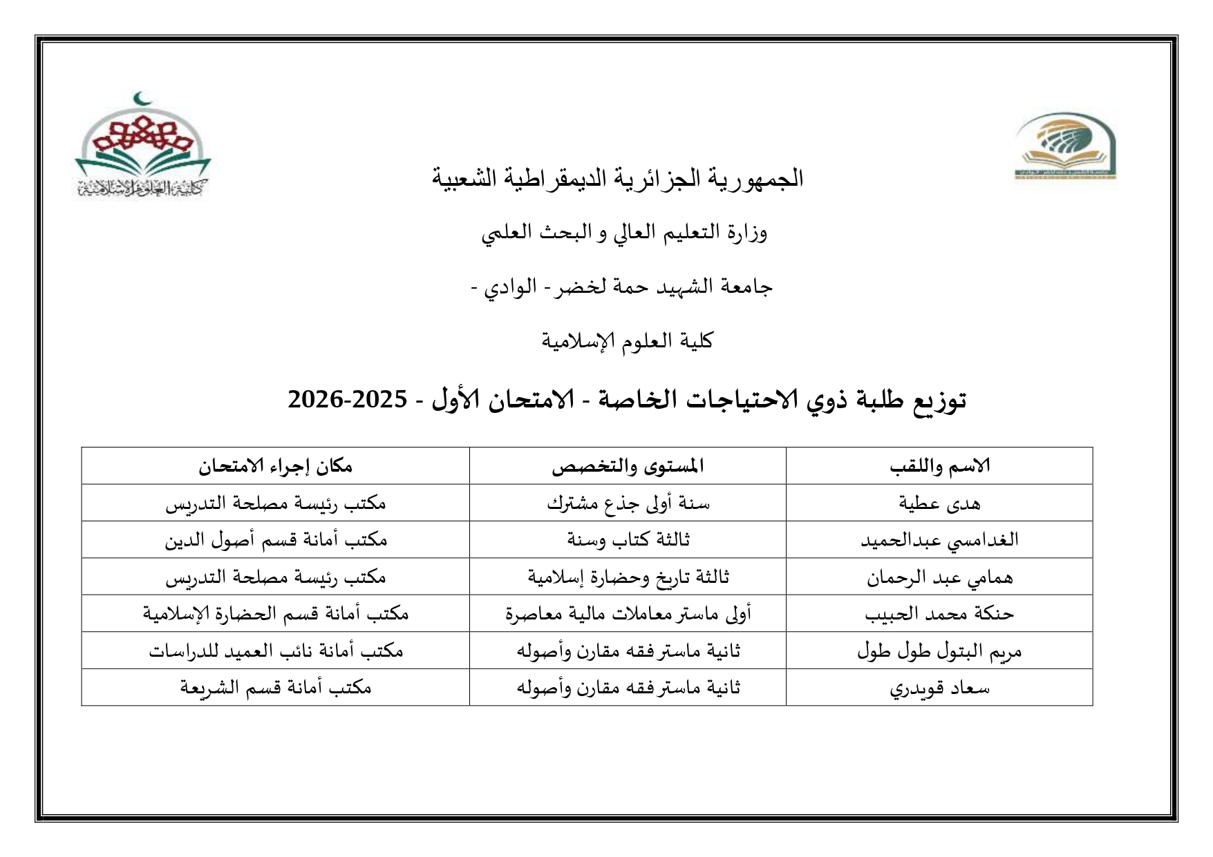 توزيع طلبة ذوي الاحتياجات الخاصة - امتحان الأول: 2026/2025