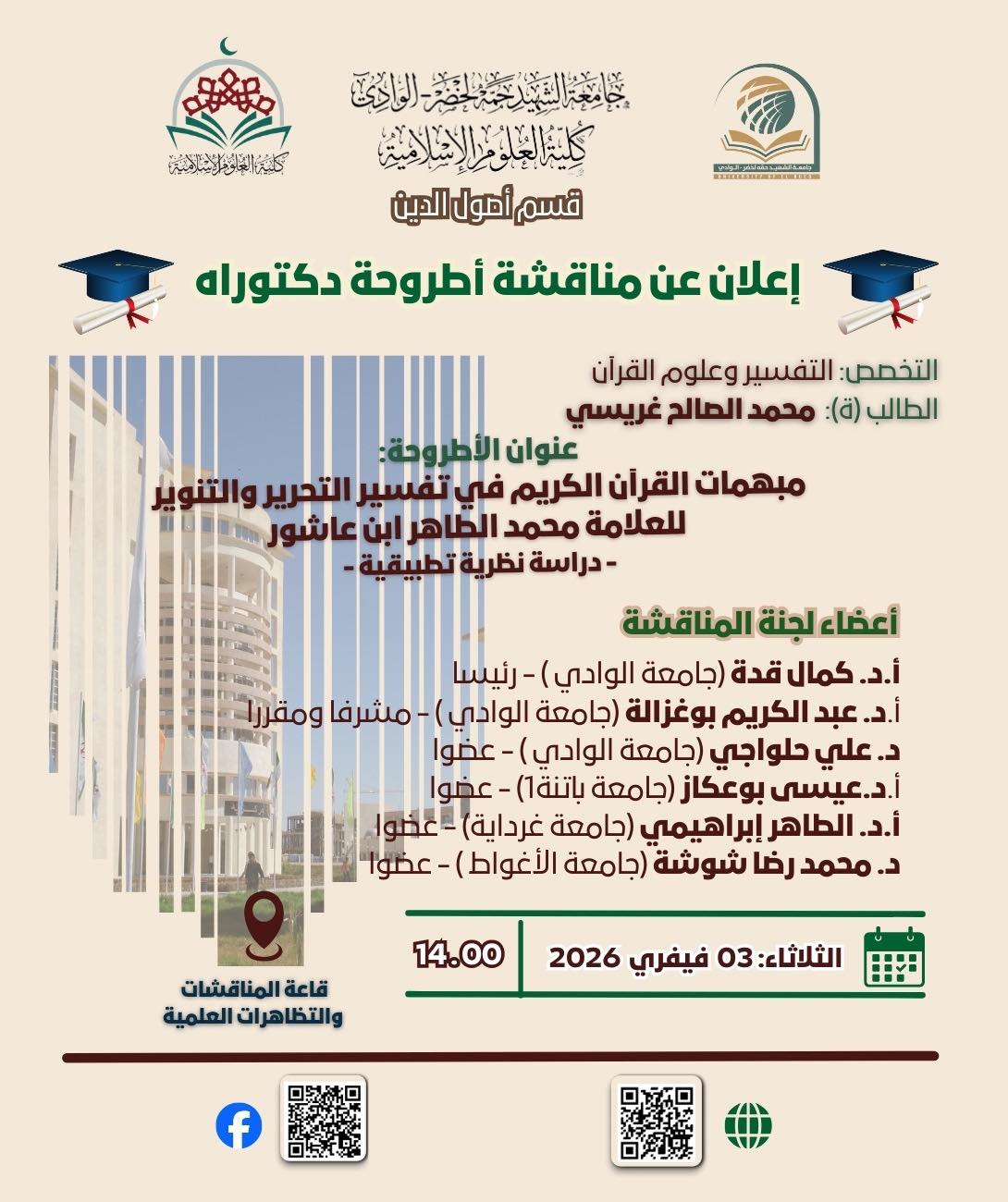 مناقشة أطروحة دكتوراه العلوم للباحث محمد الصالح غريسي.