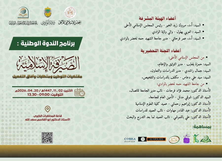 برنامج الندوة الوطنية: الصيرفة الإسلامية - مقتضيات التوطين ومتطلبات وآفاق التفعيل المزمع تنظيمها يوم الاثنين 02 ذي القعدة 1447ه الموافق 20 أفريل 2026