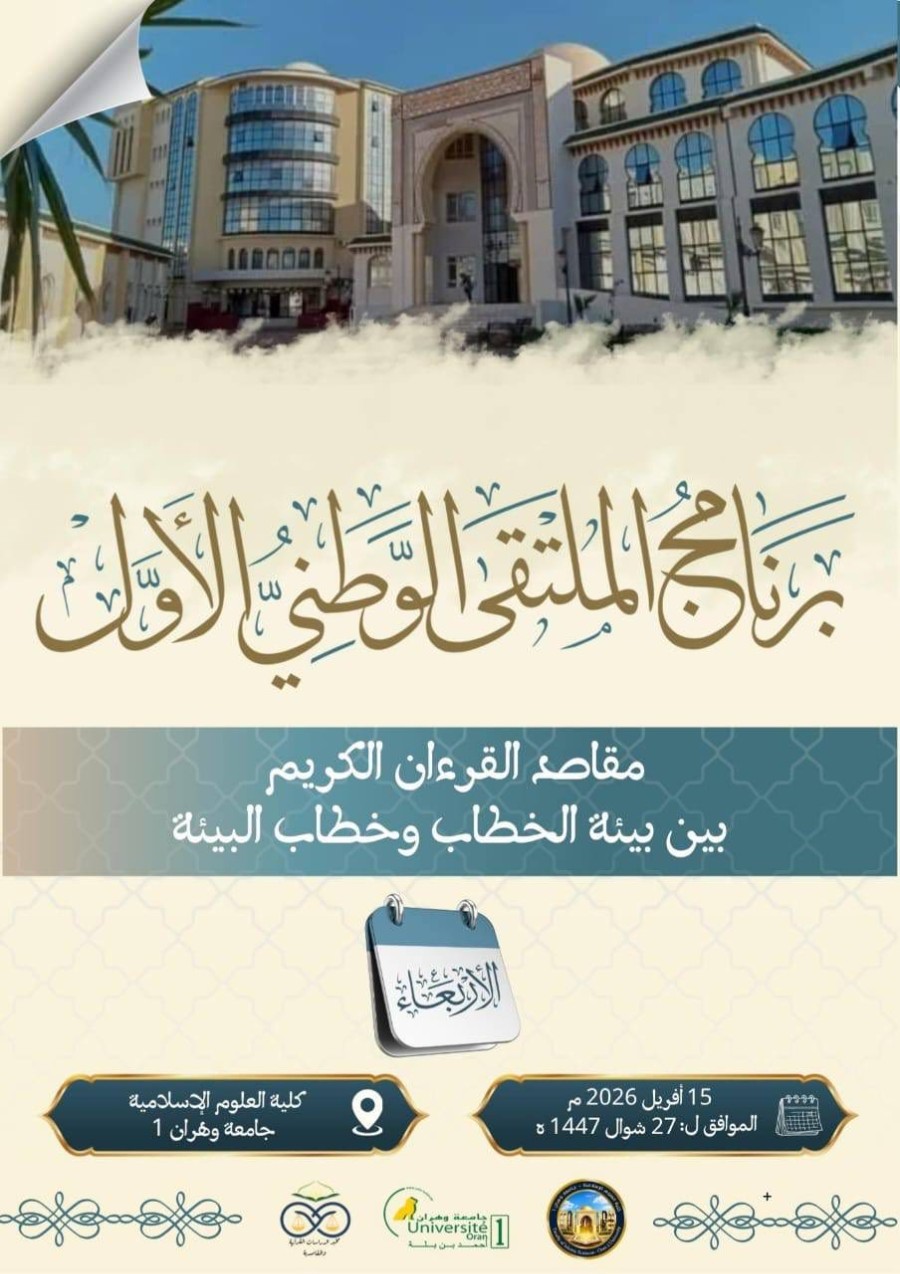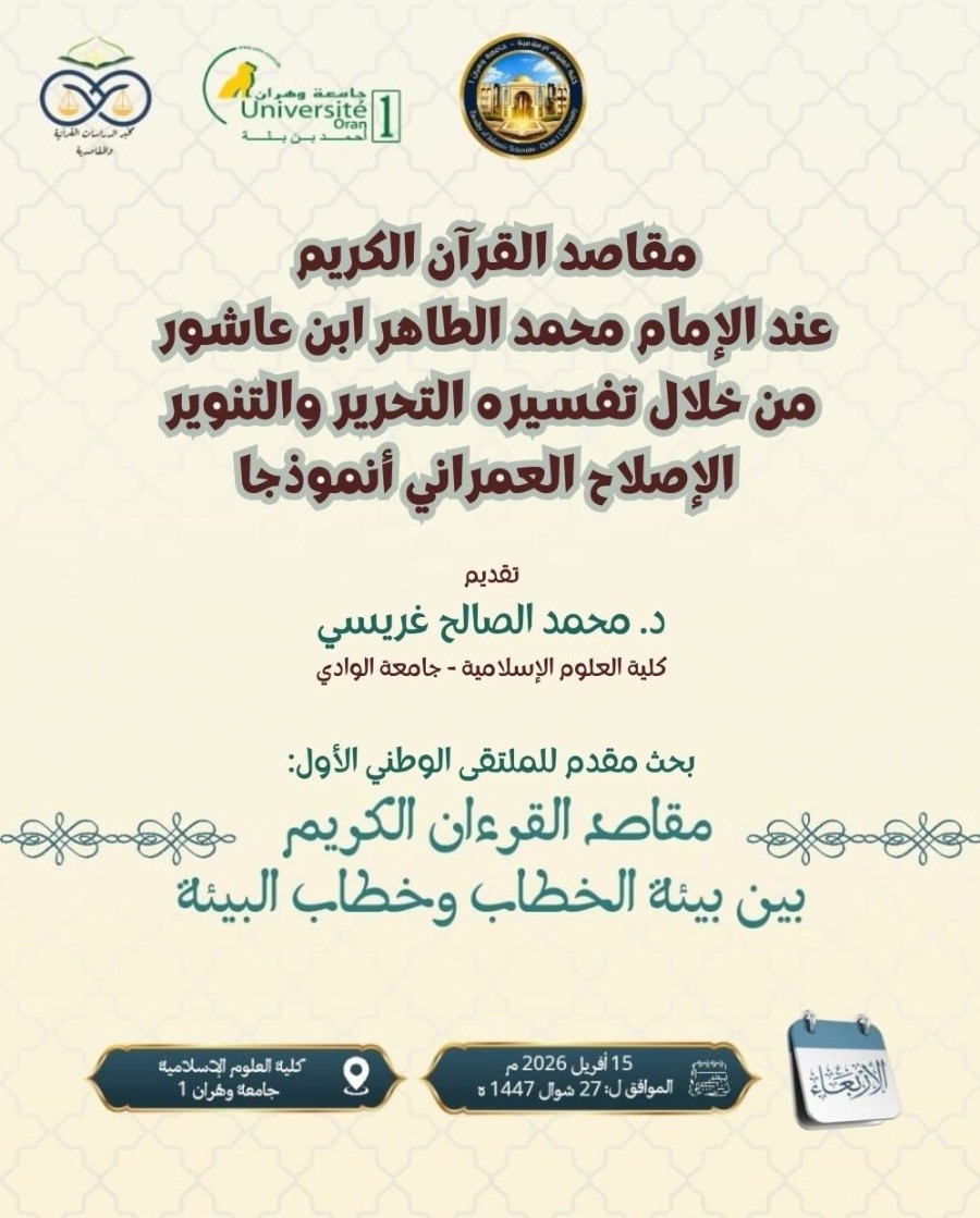 شارك فضيلة الدكتور محمد الصالح غريسي (أستاذ التفسير وعلوم القرآن بقسم الحضارة) في فعاليات الملتقى الوطني: "مقاصد القرآن الكريم بين بيئة الخطاب وخطاب البيئة"، المنظم من قبل جامعة وهران 1 يوم 27 شوال 1447هـ الموافق 15 أفريل 2026م، وكان عنوان مشاركته: مقاصد القرآن الكريم عند الإمام محمد الطاهر ابن عاشور من خلال تفسيره التحرير والتنوير - الإصلاح العمراني أنموذجا.