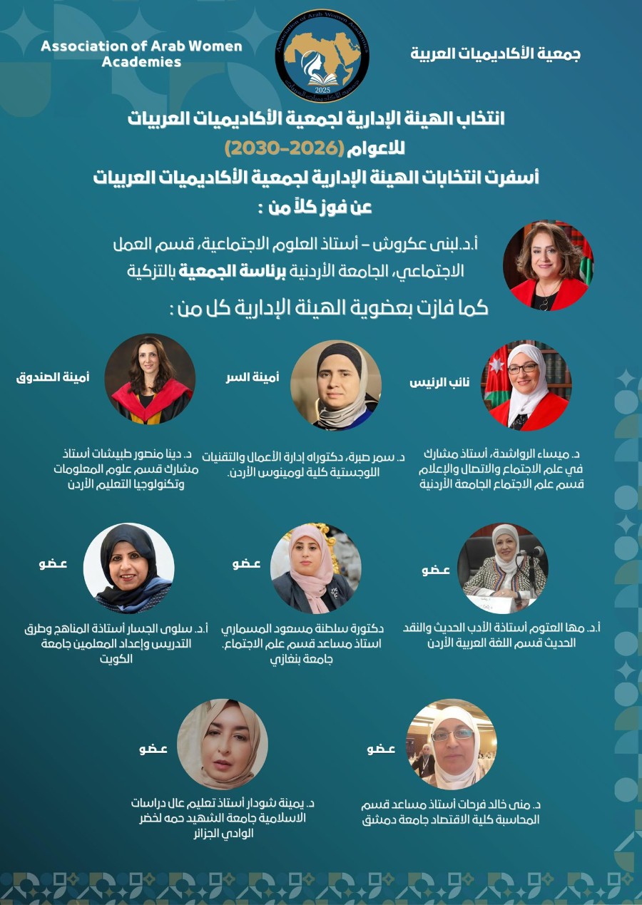 هنيئا للأستاذة الدكتورة يمينة شودار (أستاذ الفقه وأصوله بقسم الشريعة) انتخابها عضوا في الهيئة الإدارية لجمعية الأكاديميات العربيات للأعوام : 2026 - 2030م.
