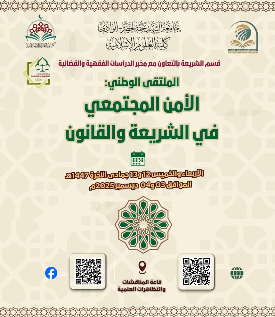 تنظم كلية العلوم الإسلامية بجامعة الوادي - الجزائر ندوة علمية دولية صبيحة الأربعاء 13 ديسمبر 2023 بالمدرج (د) ابتداء من الساعة: 09:00 حتى 11:30