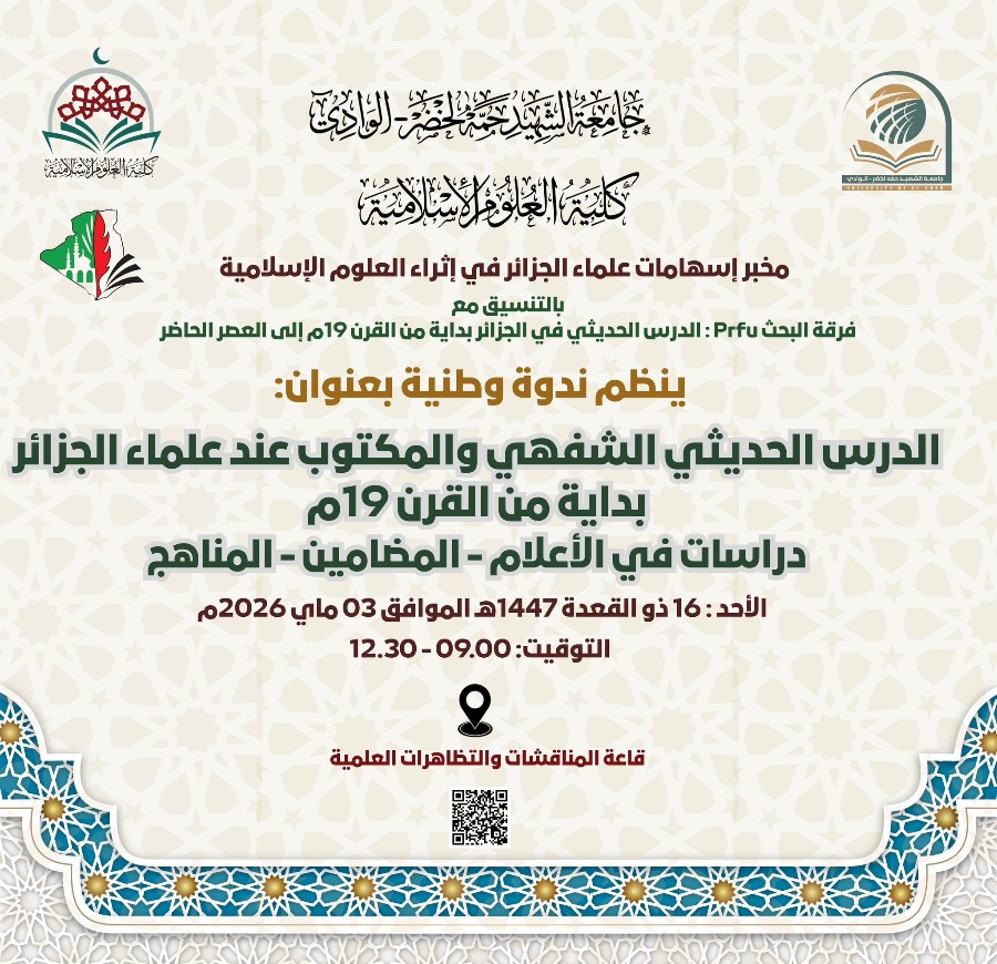 تعلن نيابة العمادة لما بعد التدرج والبحث العلمي بكلية العلوم الإسلامية - جامعة الوادي عن جلسة علنية لمناقشة أطروحة دكتوراه علوم في العلوم الإسلامية - تخصص: الكتاب والسنة . للطالب (ة): رمضان ديب